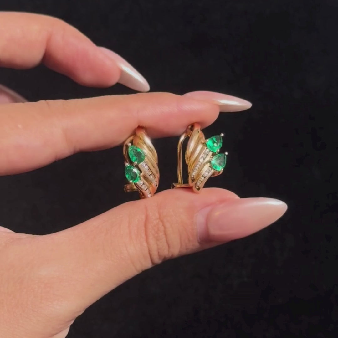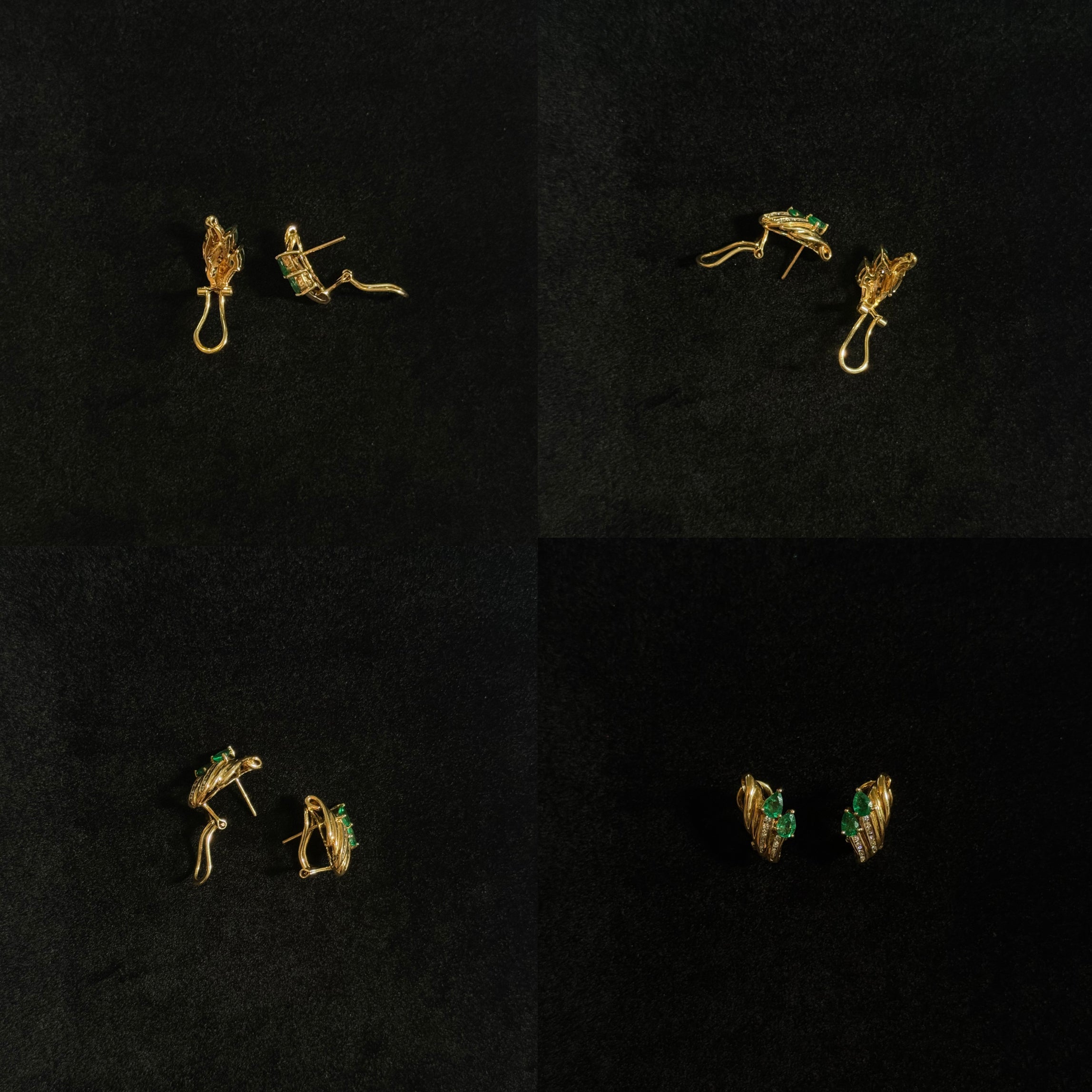 Because green has always been the color of power. Pear-cut emeralds set against ribbons of gold and diamond, shaped in a vintage curve that frames the face with authority. Secured with omega backs, these earrings are less about decoration, more about statement — the kind collectors don’t wait around for.